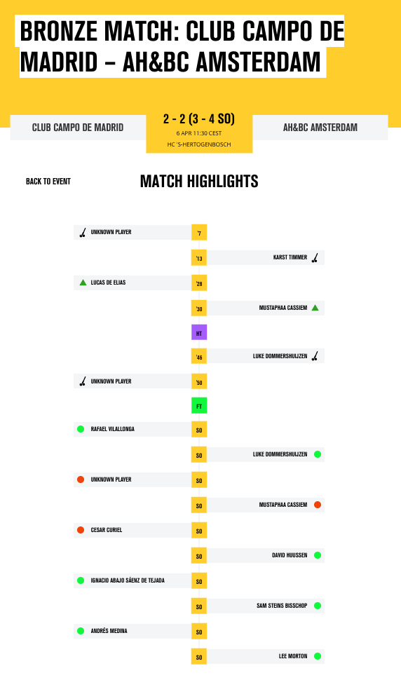 In de ultieme slotfase leek Amsterdam op het nippertje de 3-2 te maken. Het was echter de videoscheidsrechter die een streep zette door de strafcornergoal van. Campo en AH&BC moesten shoot-outs nemen.