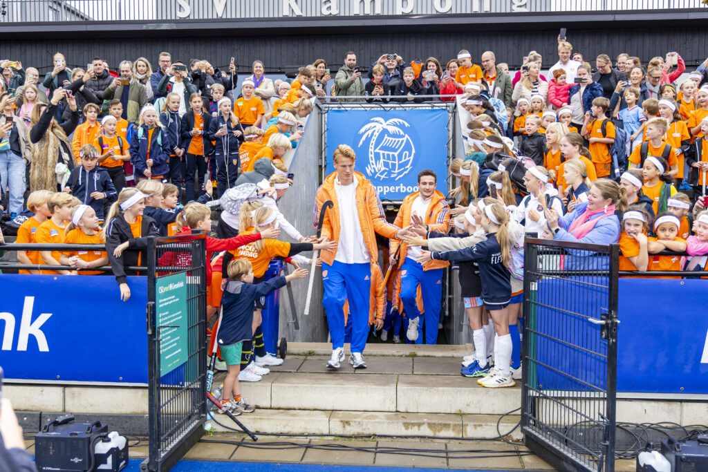 In een apart zaaltje zitten Derck de Vilder, Jorrit Croon, Felice Albers en Joosje Burg klaar achter tafels. Tientallen kinderen schuifelen langs, via een netjes afgezet pad komen ze langs al hun helden. De oranje shirts, sticks, zelfs apart meegenomen schriftjes worden op de tafels gelegd. Maar ook tijdens de clinics krijgen de spelers stiften in hun handen gedrukt en staan kinderen in de rij. Onderweg naar een ander veld wordt Sanne Koolen omringd door een zwerm kinderen, en ook Koen Bijen moet eerst een paar krabbels zetten voor ‘ie binnen een flesje water kan halen.