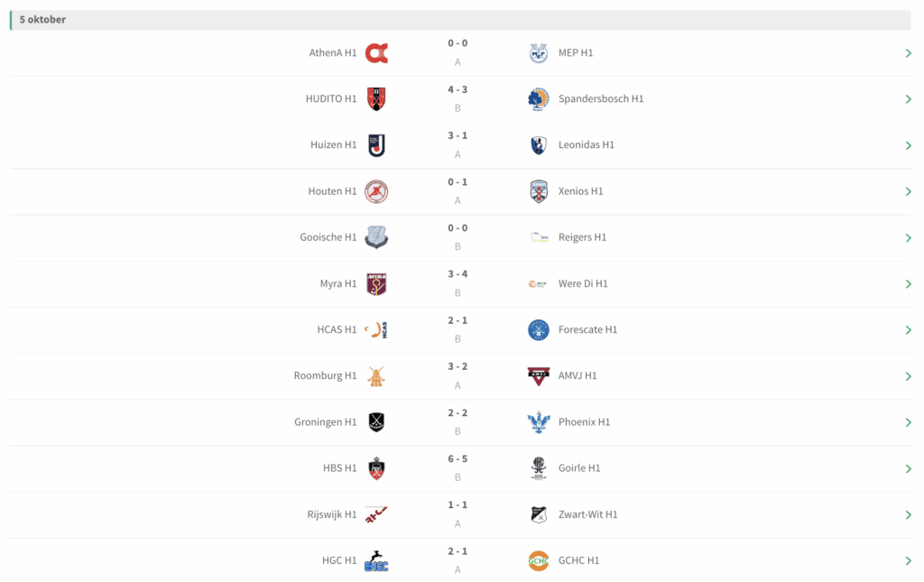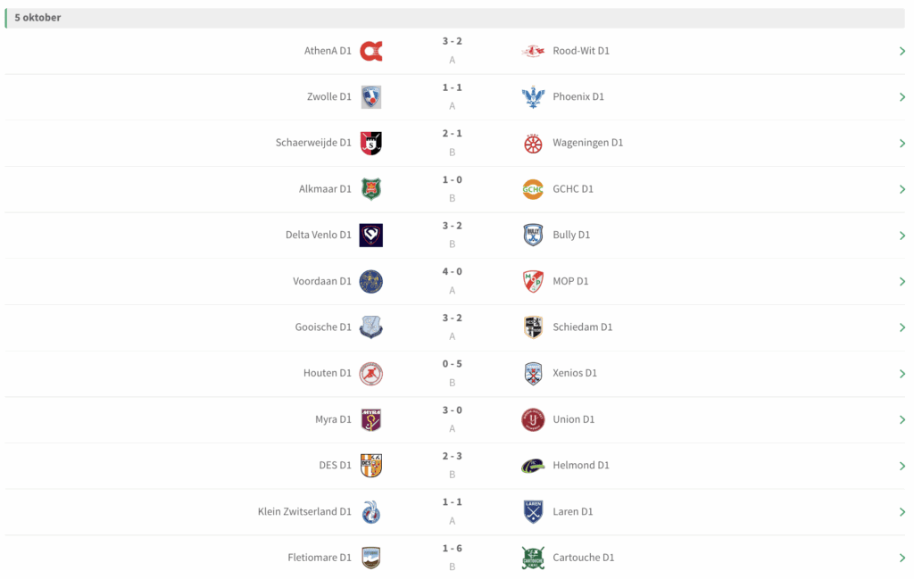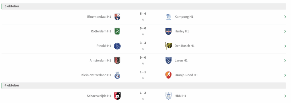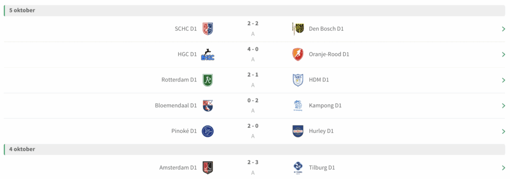 De meestbesprokene wedstrijd van dit weekend was ongetwijfeld SCHC-Den Bosch bij de dames. De landskampioen verspeelde al zes punten na thuisnederlagen tegen Amsterdam en Bloemendaal. In Bilthoven werd het tumultueus 2-2, na onder andere een rode kaart voor Pien Sanders. De topper in Bloemendaal tussen de thuisclub en Kampong eindigde in 5-4. Bekijk hier de overige uitslagen: