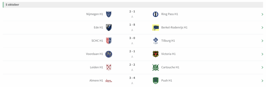 Na speelronde vijf in de Promotieklasse zijn bij de heren Nijmegen en SCHC nog foutloos. Zij wonnen hun duels van respectievelijk Tilburg en Ring Pass. Ede en Victoria wachten bij de heren nog op de eerste punten. Bij de dames is het Ring Pass dat juist de koppositie heeft veroverd. Groningen pakte het eerste punt. Bekijk hier de overige uitslagen: