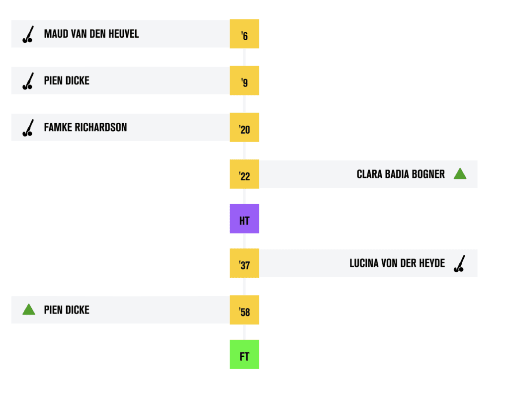 Stephanie Vanden Borre opende de score met een harde strafcorner. Louise De Waet verdubbelde na een geniale pass van Ivanna Pessina, en Helle Verlinden tikte de 3-0 binnen na een scrimmage bij de paal.
