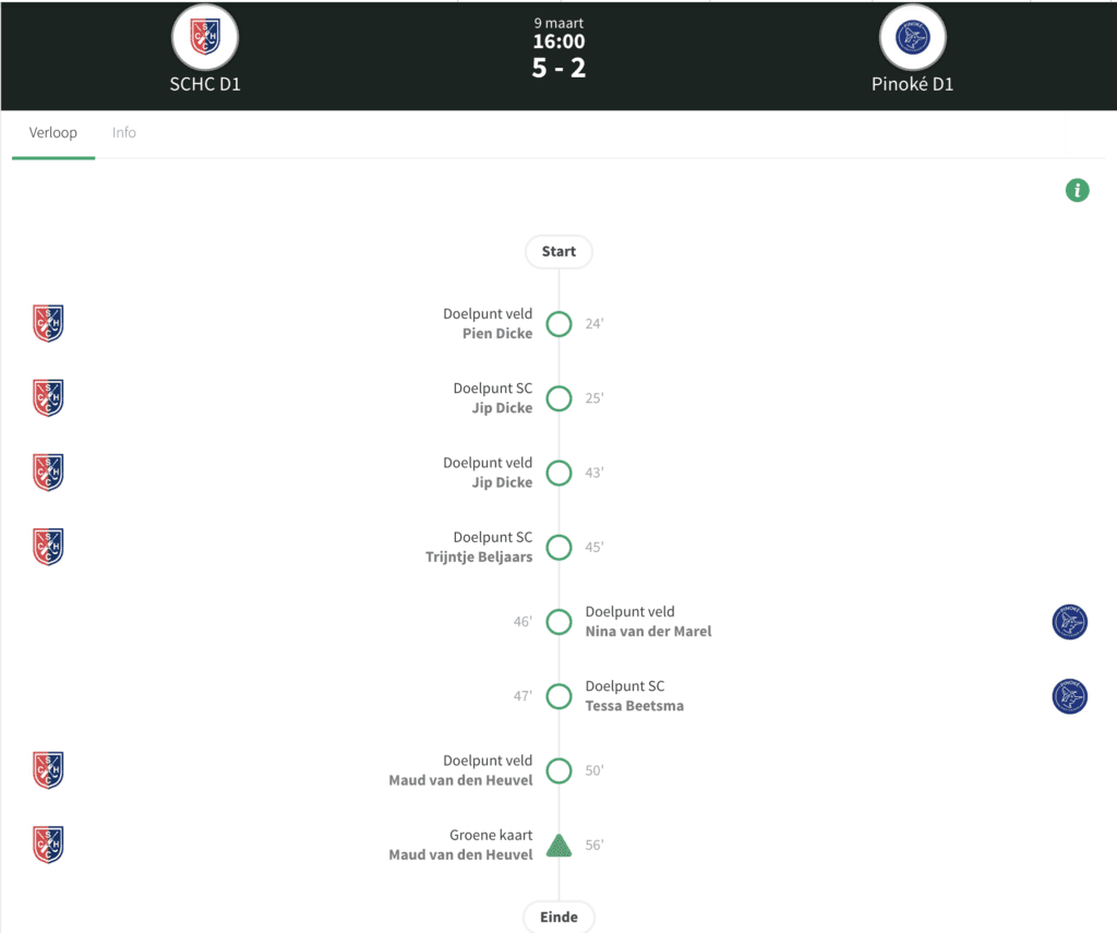 Het werd wel een beetje een slachtbank voor Pinoké. Na de 4-0 van Trijntje Beljaars leek het zelfs een beetje pijnlijk te gaan worden. De Amstelveense dames kwamen nog terug tot 4-2 door treffers van Nina van der Marel en Tessa Beetsma. De 5-2 stand kwam er door een veldtreffer van Maud van den Heuvel.